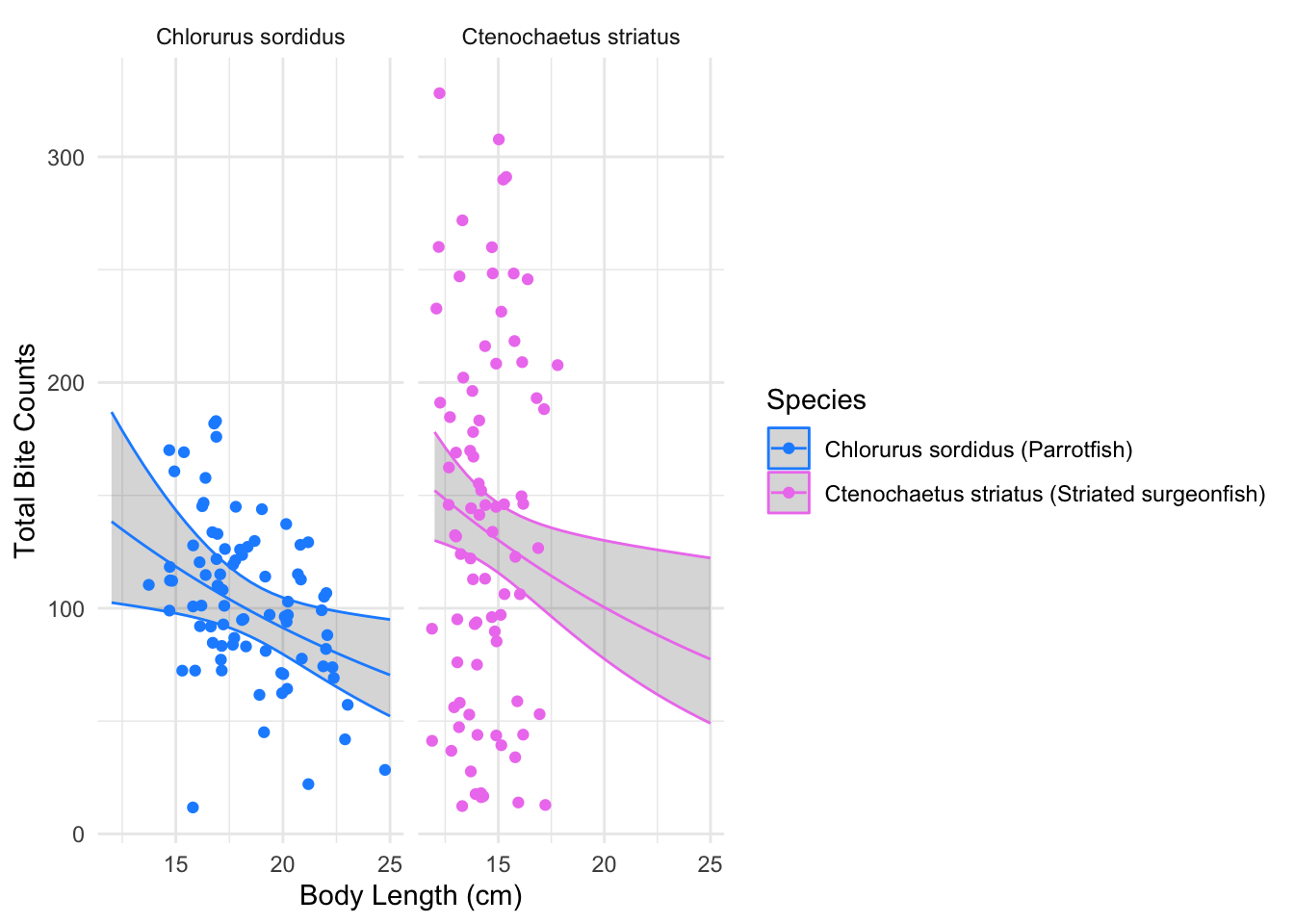 The figure displays the relationship between the length of the fish (cm) and total bite counts for parrotfish and striated surgeonfish, overlaid with predicted expected bite counts generated from the additive Negative Binomial Regression model. The 95% confidence interval is represented as the shaded grey region.