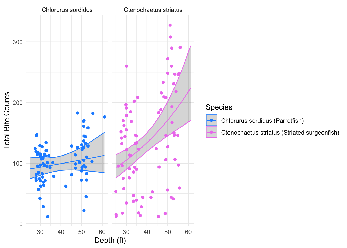 The figure displays the relationship between the depth (ft) and total bite counts for parrotfish and striated surgeonfish, overlaid with predicted expected bite counts generated from the additive-interactive Negative Binomial Regression model. The 95% confidence interval is represented as the shaded grey region.
