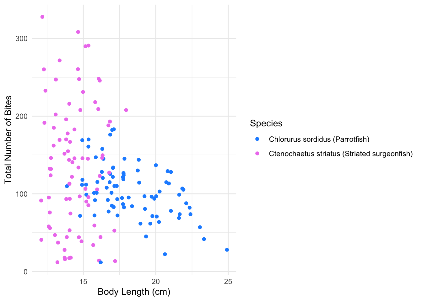 Figure 1 depicts differences in body length (cm) and total bite counts based on species. Striated surgeonfish have a wider range of body lengths (cm) compared to Parrotfish and display greater variability in total bite counts. Parrotfish body length (cm) and bite counts appear to be more clustered.