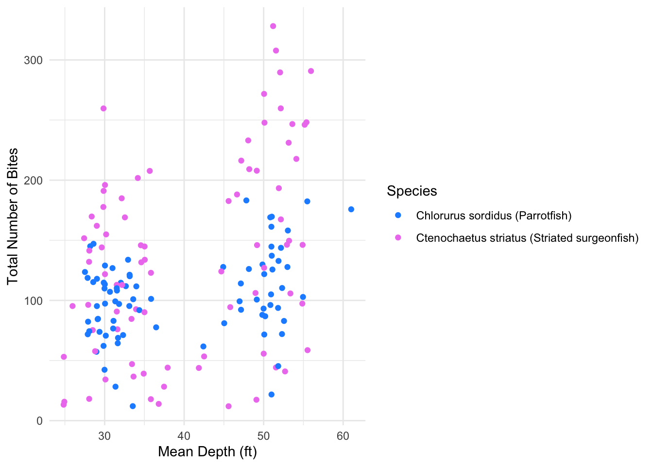 dominant_substrate = factor(dominant_substrate))The data source provides two datasets that hold observational dat from different dates and locations in Moʻorea. After stacking the dataframes, columns that were not required for the analysis were dropped. Some cleaning of our variables was also conducted. A mean_depth column was created, which is the average depth during each observation. This was created by taking the average depth between the recorded depth at the start and end of the observation. A dominant_substrate column was also created, which represents the substrate that was bitten the most of all the possible substrates. This was done by detecting which substrate had the highest number of bites for each observed fish.