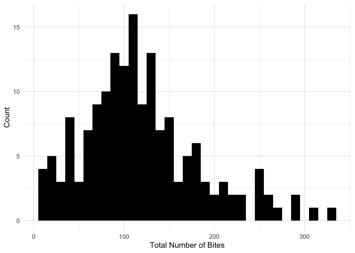 [1] "Calculations show that the variance of the `total_bites` is greater than the mean of `total_bites`."