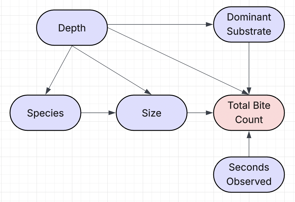 This DAG illustrates our hypothesized causal structure between predictors and the total bite counts. Depth directly affects dominant substrates, species, size, and total bite count. Species affects the total bite count through its effect on the size variable. Depth, dominant substrate, and size all influence total bite count. Observation time directly influences total bite count, but does not affect any other variable.