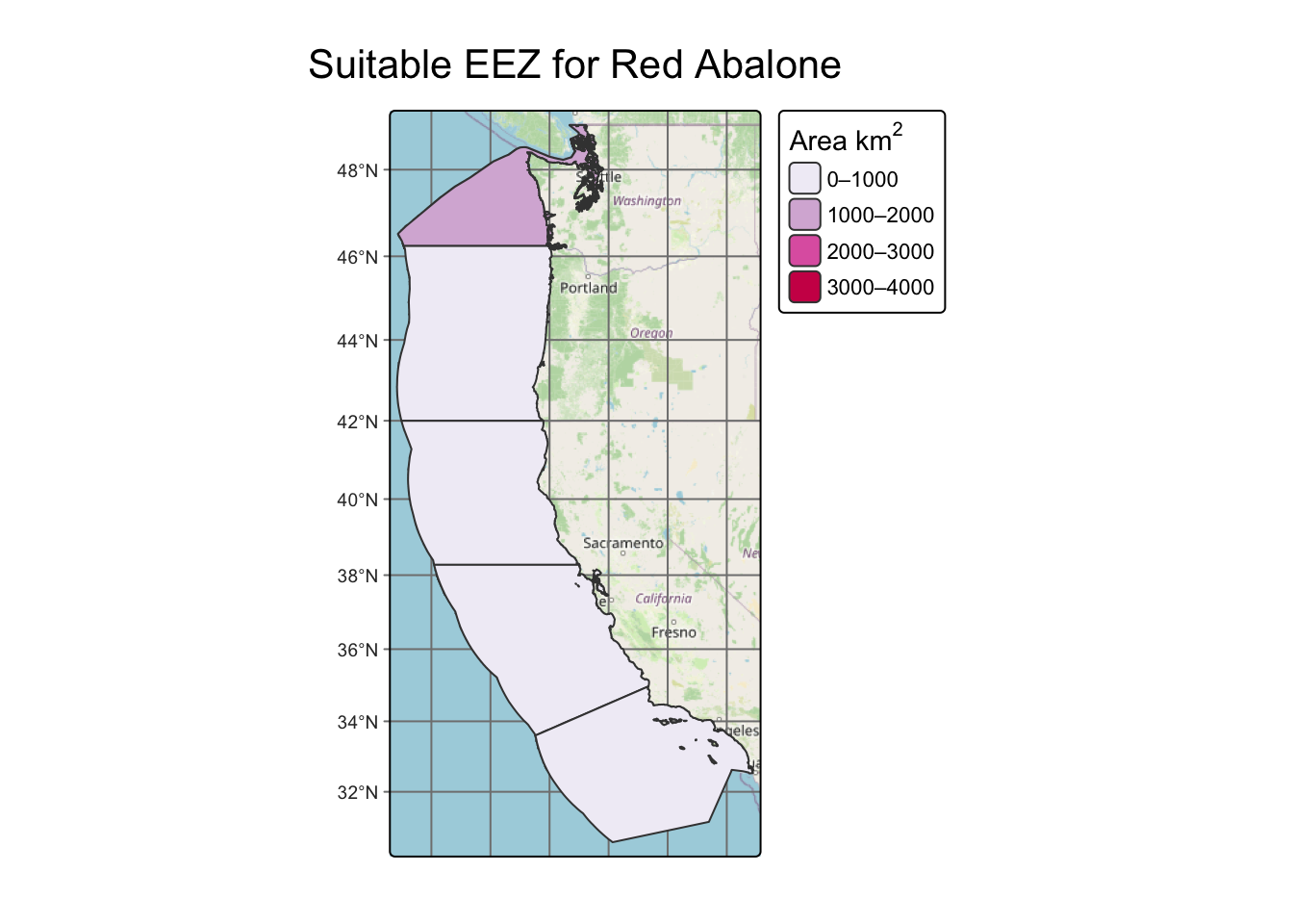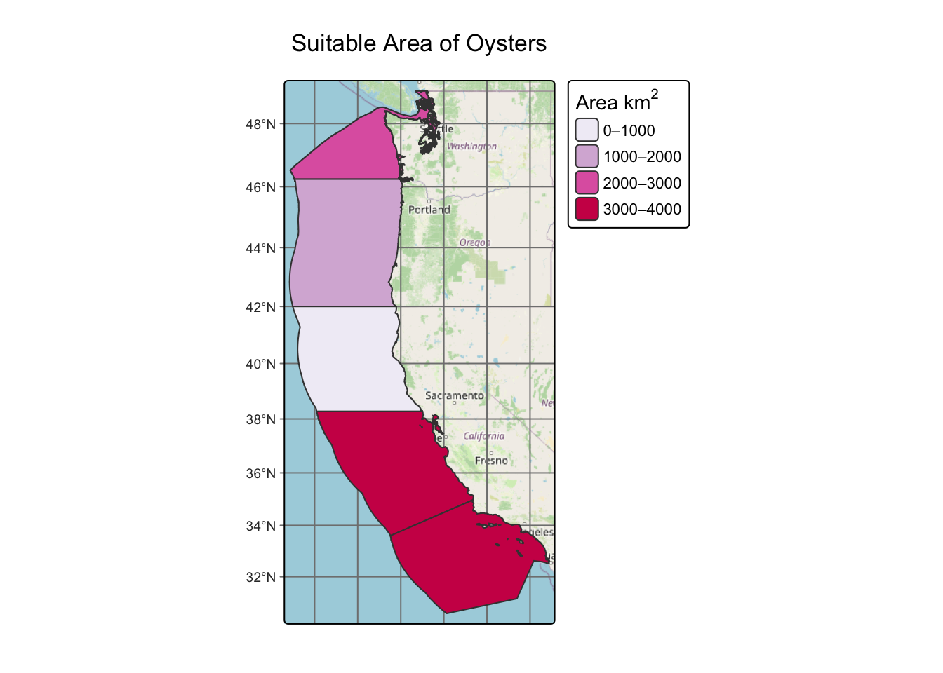 Spatial analysis of suitable habitat areas along the west coast (USA) for marine aquaculture.